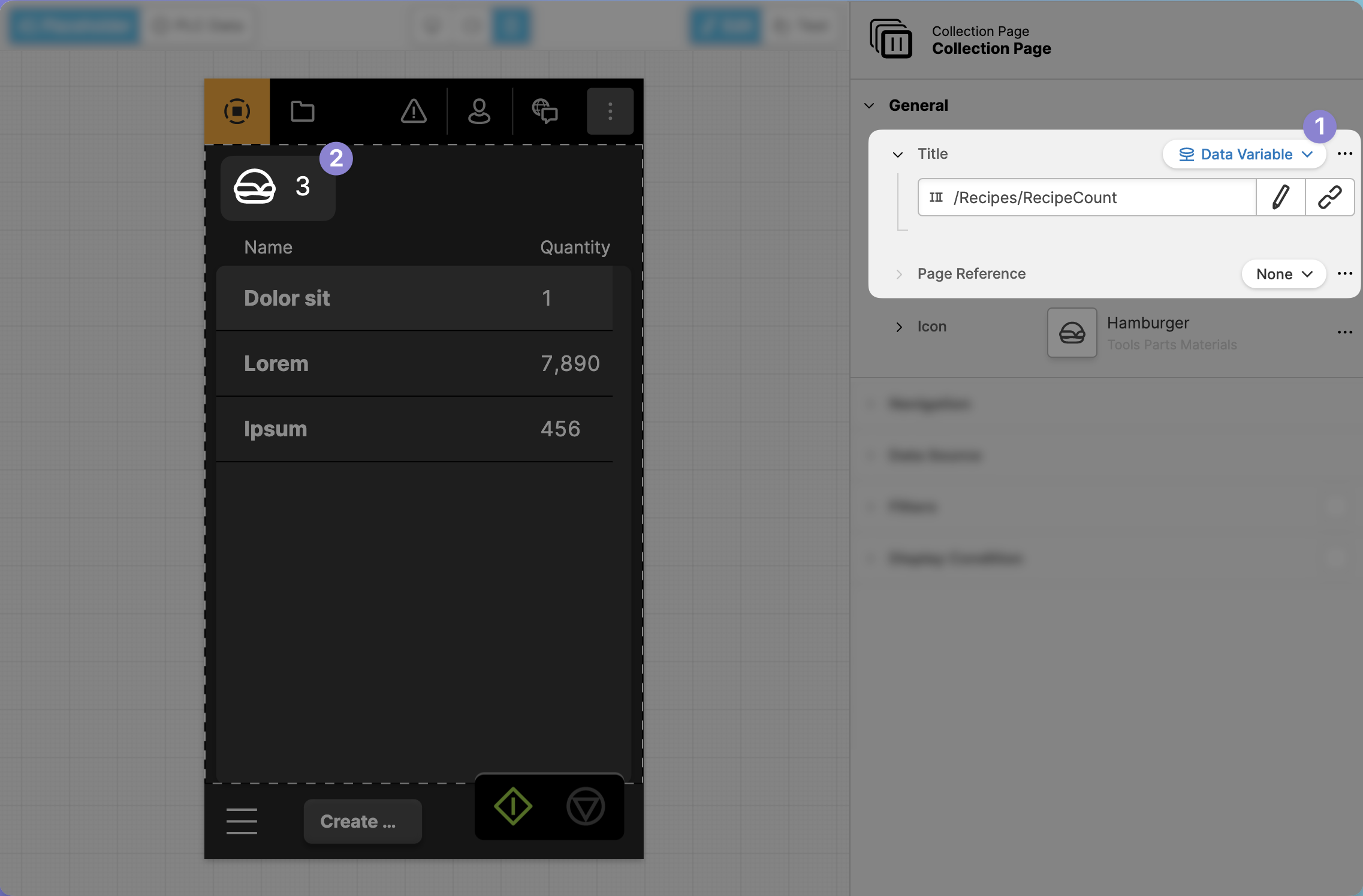 Data Variable, you are able to link it to a variable. In this case, we choose the variableRecipeCount. - In the preview, you can now see result of this change: the number of overall recipes is now being displayed instead.