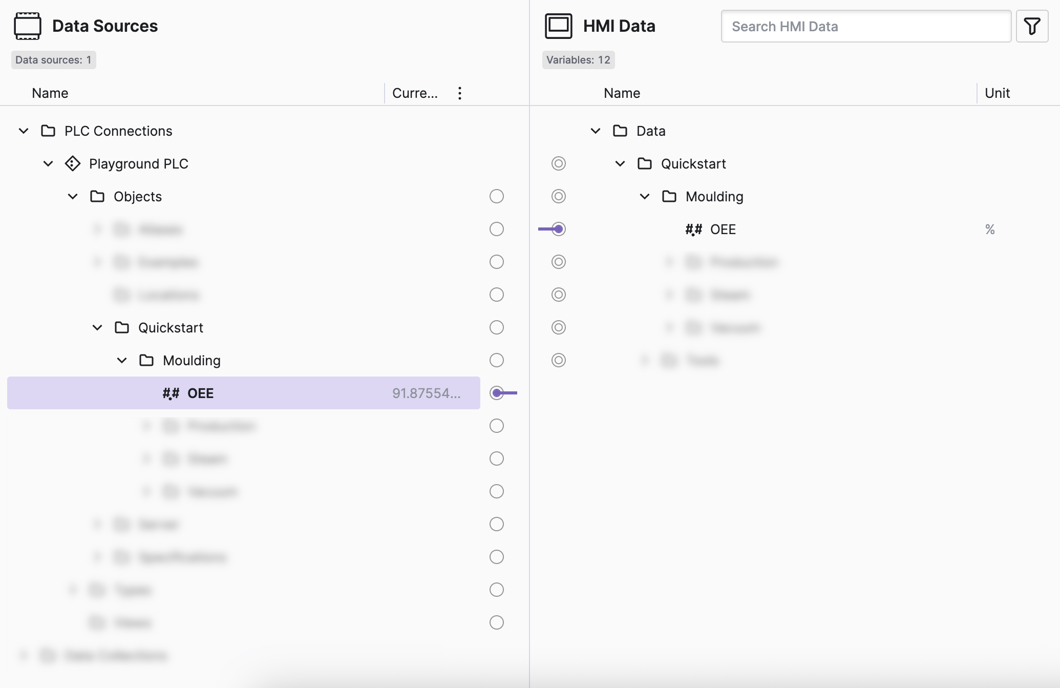 Click the circle on the left of the "OEE" variable within the HMI Data Explorer to connect the two values.