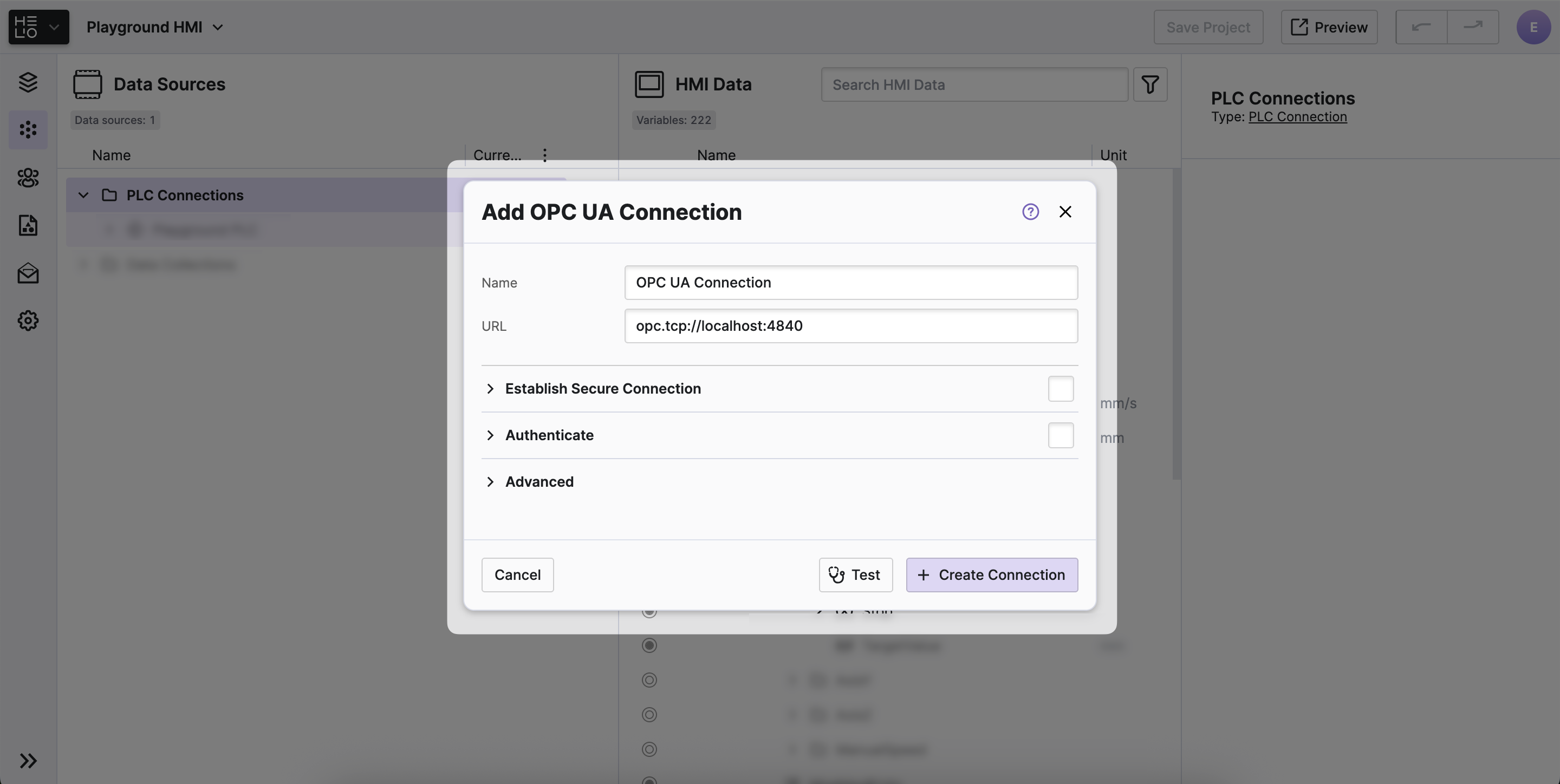 HELIO can connect to different Data Source Types. For HMIs, the PLC Connection is the most important, as it allows you to connect to your PLC using standardized protocols. In this guide, we're gonna mainly focus on OPC UA, because it's pretty popular and widely accepted.