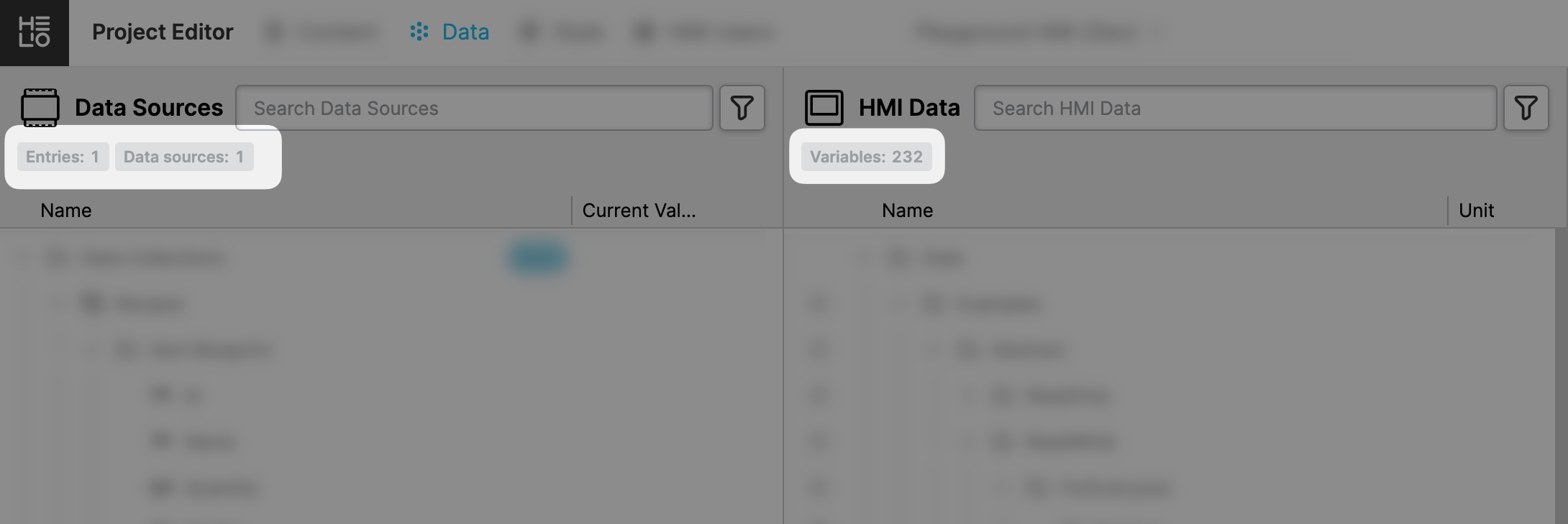 Open your project using the Project Editor and navigate to the Data View. You can find both, the count of data sources as well as variables at the top the Data Source Explorer and HMI Data Explorer.