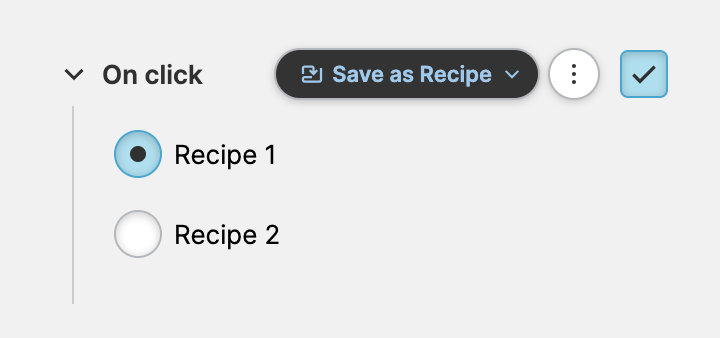 ReferenceActionsData & PLCSave as RecipeVersion: 25.4 (stable)On this pageSave as Recipe Action About Opens the Save Recipe dialog, to enable operators to save or override recipes and set a name for them. Properties Recipe TypeChoose one of the predefined Recipe Types to be saved via the Save Recipe dialog. Related ElementsRecipe Management PageActive Recipe MetadataButton GuidesRecipe Management